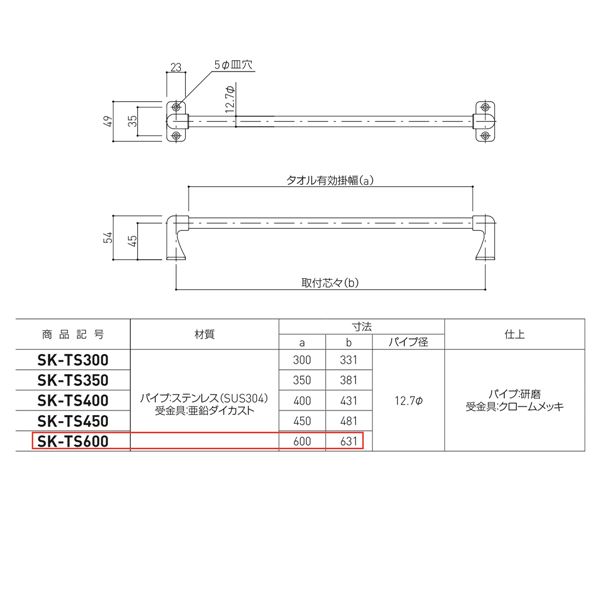 ■サイズ・色違い・関連商品■SK-TS300■SK-TS350■SK-TS400■SK-TS450■SK-T300■SK-T350■SK-TS600[当ページ]■SK-T400■SK-T450■SK-T600■SK-TJ350■SK-TJ400■SK-TJ455■SK-ST-1■SK-TJ600■SK-ST-2関連商品の検索結果一覧はこちら■商品内容ステンレス製パイプ(丸)のタオル掛になります■商品スペック【寸法】タオル有効掛幅:600mm 取付芯々:631mm パイプ径:12.7φ【材質】パイプ:ステンレス(SUS304)10φ 受金具:亜鉛ダイカスト(クロームメッキ)■送料・配送についての注意事項●本商品の出荷目安は【3 - 8営業日 ※土日・祝除く】となります。