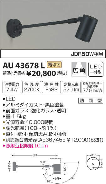 ページ内のPC版表示をクリックしてご確認ください 【カラーバリエーションはこちらをクリック】 ●スポットライト センサー無し特集●スポットライト 人感センサー特集●スポットライト スパイクタイプ特集 ●スポットライト 看板照明特集●スポットライト 防犯灯特集●KOIZUMI照明TOPへ移動 ●関連商品 アウトドア関連部品 AE44105E3,058円アウトドア関連部品 AE44106E3,058円 スポットライト 看板照明 AU43675L JDR50W相当 中角 シルバーメタリック 11,986円 スポットライト 看板照明 AU43677L JDR50W相当 中角 黒色 11,986円 スポットライト 看板照明 AU43676L JDR50W相当 広角 シルバーメタリック 11,986円 スポットライト 看板照明 AU43678L JDR50W相当 広角 黒色 11,986円