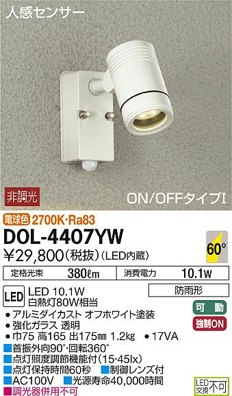 ページ内のPC版表示をクリックしてご確認ください 【カラーバリエーションはこちらをクリック】 ●スポットライト センサー無し特集●スポットライト 人感センサー特集●スポットライト スパイクタイプ特集 ●スポットライト 看板照明特集●スポットライト 防犯灯特集●DAIKO照明TOPへ移動 ●関連商品 スポットライト DOL-4592YS 白熱灯80w相当 センサーあり ウォームシルバー 18,937円 スポットライト DOL-4407YS 白熱灯80w相当 センサーあり シルバー 18,937円 スポットライト DOL-4407YB 白熱灯80w相当 センサーあり 黒色 18,937円 スポットライト DOL-4407YW 白熱灯80w相当 センサーあり オフホワイト 18,937円 スポットライト DOL-4591YS 白熱灯80w相当 ウォームシルバー 12,581円 スポットライト DOL-4406YS 白熱灯80w相当 シルバー 12,581円 スポットライト DOL-4406YB 白熱灯80w相当 黒色 12,581円 スポットライト DOL-4406YW 白熱灯80w相当 オフホワイト 12,581円